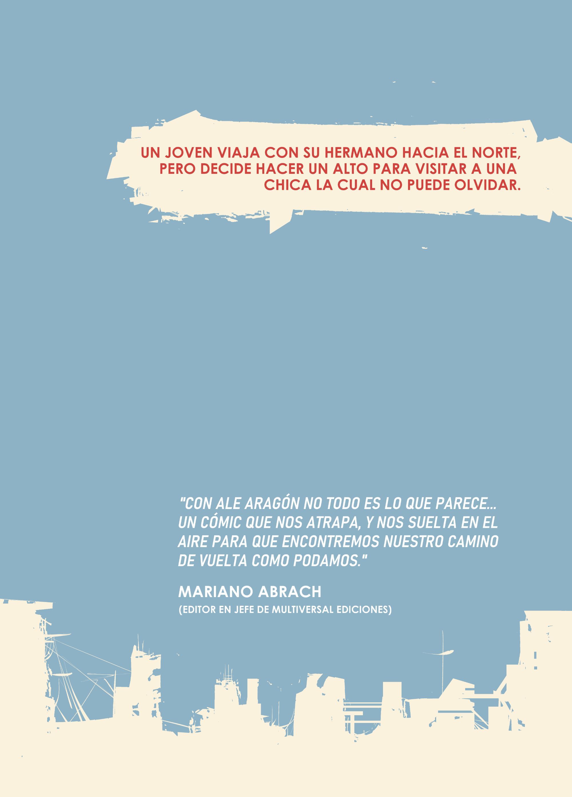 Historieta corta escrita y dibujada por Alejandro Aragón (DEATH ORB, 28 DAYS LATER, THE EXPANSE) 16 páginas. Color. (Solo disponible en versión digital PDF) SINOPSIS: En un futuro distópico, un joven viaja con su hermano hacia el norte, pero decide hacer un alto para visitar a una chica la cual no puede olvidar. GÉNERO: Ciencia Ficción- Drama