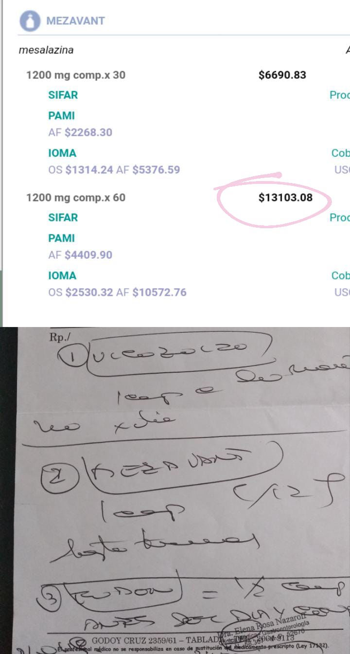 Mesalazina = 2 comp por día, todos los días1 vez al año necesito una endoscopia y colonoscopia, lo cual este año no pude hacer.