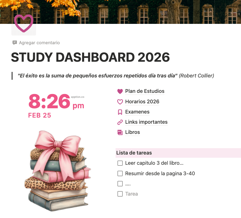 Sistema de organización integral para estudiantes universitarios. Incluye gestión de materias, calendario de exámenes y estética minimalista.➡️ https://shadow-cement-c91.notion.site/STUDY-DASHBOARD-2026-30c26dccb20a80ea96c9e6d2b41a5ae4 Diseñado con ❤️ por Mara V.📸 Instagram https://www.instagram.com/studygram_mara🎀 YouTube https://www.youtube.com/@studygram_mara🤎 TikTok https://www.tiktok.com/@studygram_mara¿Te sirvió esta plantilla? Me ayudás un montón invitándome un cafecito para seguir creando contenido gratuito para la comunidad ☕️ ✨ https://cafecito.app/maravalvy© 2026 Mara V. (@studygram_mara) – Todos los derechos reservados.Esta plantilla es de uso personal y gratuito. Queda prohibida su venta, redistribución o uso comercial sin autorización previa. Si te sirve y la compartís, ¡etiquetame así la comunidad crece!