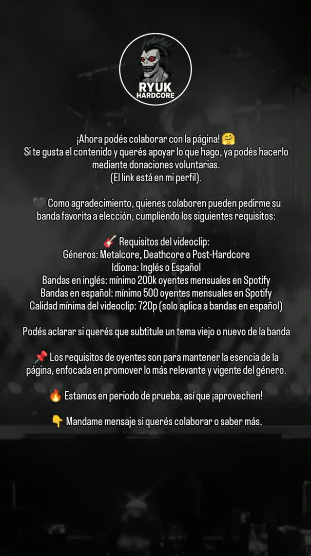 En agradecimiento por parte de Ryuk Hardcore puedes pedir tu banda favorita🤗